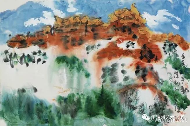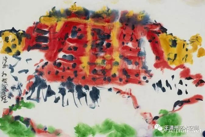 王清州先生的艺术视野开阔,创新意识很强。更加强调色彩,同时也保留水墨。其画法也难以归类,既不是传统的没骨,又不是西画的水彩。有些把色彩与水墨结合起来,有些完全以色彩经营整个画面,与中国传统水墨画大异其趣,给人以全新的视觉感受。