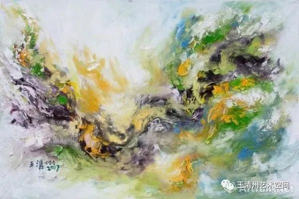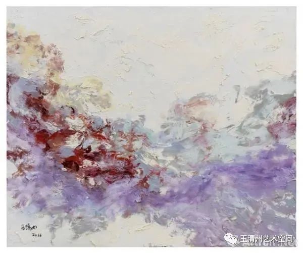 “宽境”宽而广、境而真,笔触挥洒于天,墨色染于地,光影的投色变化无常,无山是山,无水是水 ,如万物初生,如四季之美,艺术家借由笔产生物象,油彩与墨融合为一。如“静,镜,净,境”。画如人生。