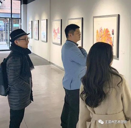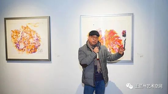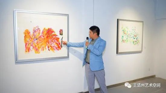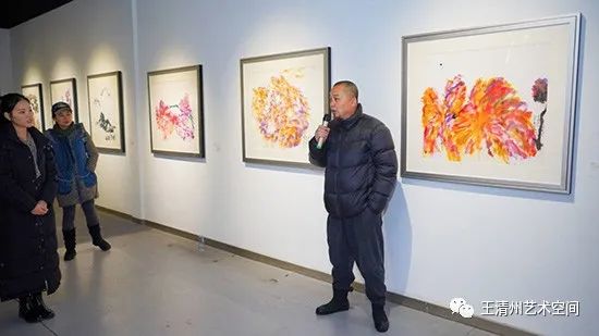 我们到现场的时候,看到很多作品的状态,王清州所有作品的状态基本都是在现场完成,所以说我们看到他的作品既有抽象画又有具象化的感觉,很随性。我们现在看一看,我们在布展过程当中,考虑到王清州作品的这种节奏,因为他的画面当中有的是很密集,有的画面当中又是很空灵的。所以我们在布置中,把他的这种节奏给放开一点,前面有复杂的创作,后面的作品当中呈现一些简洁的,无论是复杂画面还是简洁画面,他表达出来还是一种东方写意的精神,而这种色彩和用纸,有他自己这种专业的考究。我们往下面走走,尤其是到了这件作品,最近我们拿到这件作品的过程当中在仔细看,好多人提出来像印刷品。后面在在交流中,他这样的作品细节是通过三层纸两层纸这样的,宣纸的韵染,漏色,慢慢的渗透到纸的当中,看到了很多细腻的东西。最后他为了体现这个,打破这个朦状态,他用了几笔的花卉的主干把它提出来,所以看着又像染汁,又有点韵墨的味道又有点绘画性又有点书写性的东西,结合融入到一起。