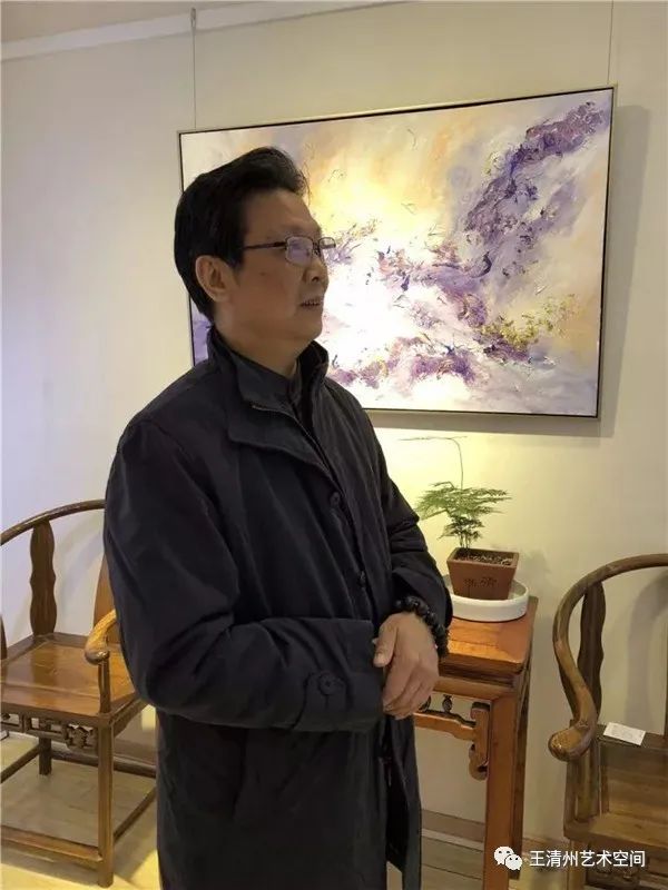 据王清州介绍,他对于色彩的独特感受力,一部分来自西方绘画的影响,但更多地来自中国绘画传统自身所蕴藏的对色彩的原始应用。“关于我画面的色彩问题,我在欧洲办的十几次展览和美国办的几次展览上,他们都问过我这个问题,我都回答的是,主要来自我们本民族的绘画传统。”结合展览现场的展览作品,看过王清州的个人艺术履历,相信很多人都会问这样一个问题,他是怎么从传统书法,到水墨、到油画;从具象到抽象从容转变的?。带着这个问题,我采访了王清州。他说,“我的画面在抽象与具象之间是可以自由来回游走的,比如现在让我画一只鸟,来一支竹子,画幅兰草山石,都可随手拈来。实际上在具象和抽象之间,我始终保持在进退有余的状态。”“抽象与具象都不是我画画的最终目的,我画画的目的还是因为自己内心感受的驱使。”