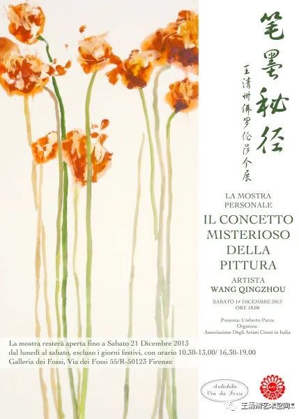当地时间2013年12月14日星期六,由意大利华人艺术家协会主办的王清州个人艺术展“笔墨秘径”于佛罗伦萨Dei fossi画廊成功开幕。本次展览由意大利著名艺术评论家Umberto Putzo为学术主持,并为展览撰写了千余字的评论文章。开幕式采用了一场学术研讨会的形式,到场了数十位佛罗伦萨文化、艺术界人士,由Umberto Putzo做现场主持,向到场嘉宾阐述了王清州的绘画作品的创作理念,讲解了其作品与欧洲作品的异同,给予很高评价。意大利华人艺术家协会副主席张丞森出席活动并致词。王清州先生也向大大致词表示欢迎,并作学术性演讲。